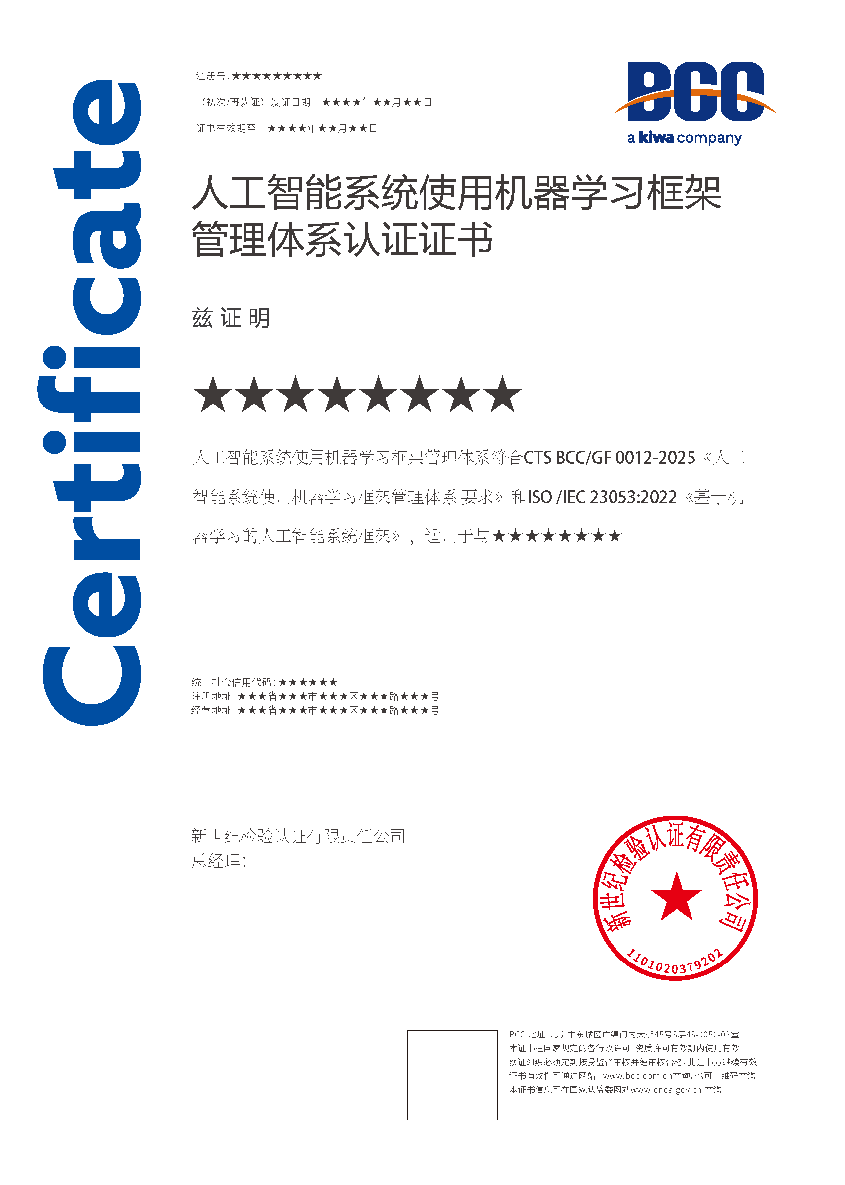 本頁涉及的認證服務中均有對應的《認證實施規(guī)則》,BCC擁有其最終解釋權。任何組織及個人未經BCC許可,不得以任何形式全部或部分使用(法律要求除外)認證相關信息。如需獲取相關實施規(guī)則請用以下方式聯(lián)系獲?。弘娫挘?10-58579316 郵箱:fwjs@kiwa.cn