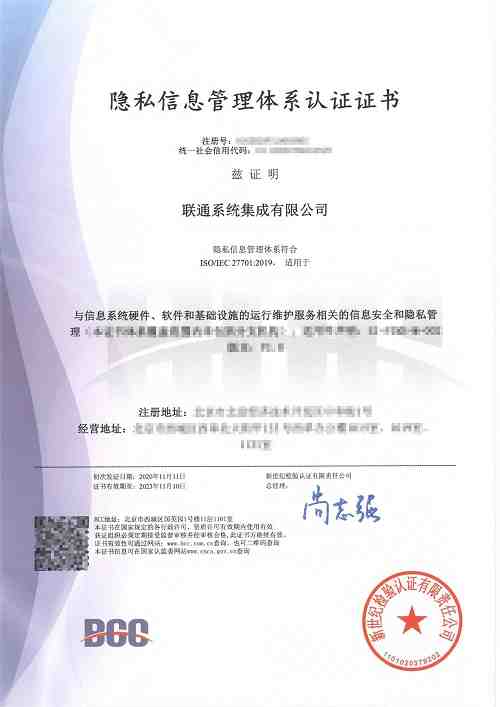 2020年11月13日,聯(lián)通系統(tǒng)集成有限公司(以下簡稱:聯(lián)通系統(tǒng)集成)順利獲得由新世紀檢驗認證有限責(zé)任公司(以下簡稱:BCC)頒發(fā)的ISO/IEC 27701 隱私信息管理體系認證證書。