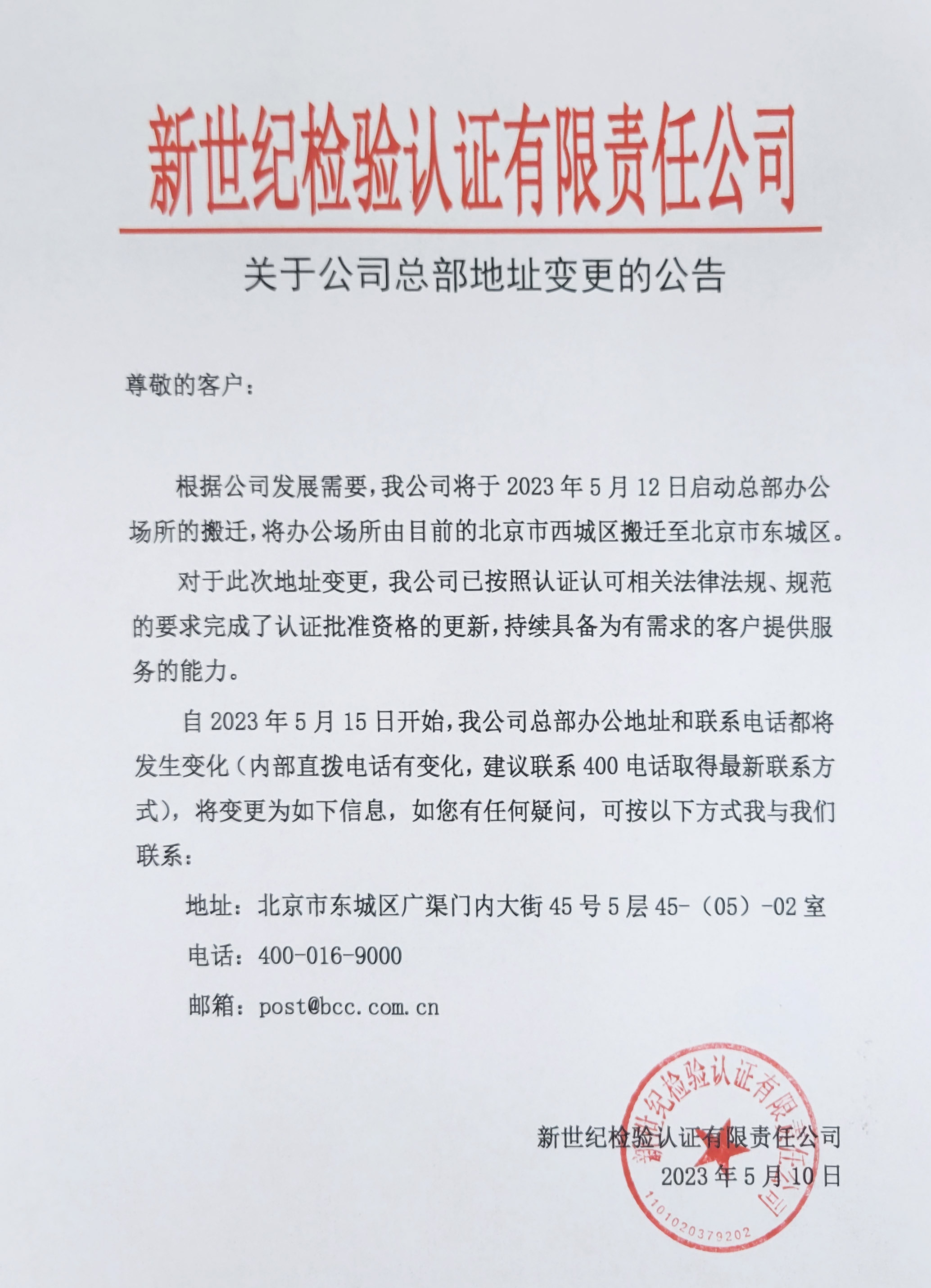 對于此次地址變更,我公司已按照認證認可相關(guān)法律法規(guī)、規(guī)范的要求完成了認證批準資格的更新,持續(xù)具備為有需求的客戶提供服務(wù)的能力。