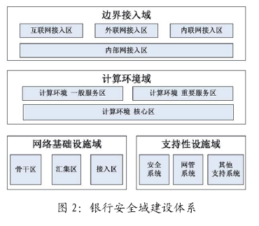 網(wǎng)絡(luò)安全域主要是在相同的系統(tǒng)當(dāng)中,按照信息各自的性質(zhì)差異、使用方法、安全等級加以劃分的各種子網(wǎng)絡(luò)。銀行在進行網(wǎng)絡(luò)安全域建設(shè)時,需要遵循以下幾大原則:業(yè)務(wù)保障原則、結(jié)構(gòu)簡化原則、等級保護原則以及生命周期原則。通常而言,對網(wǎng)絡(luò)安全域進行劃分時并非單純由某一層次入手,而是會劃分為多個層次,從而才能深入監(jiān)管。銀行在網(wǎng)絡(luò)安全域建設(shè)方面,應(yīng)該參照圖 2 所示的建設(shè)體系。