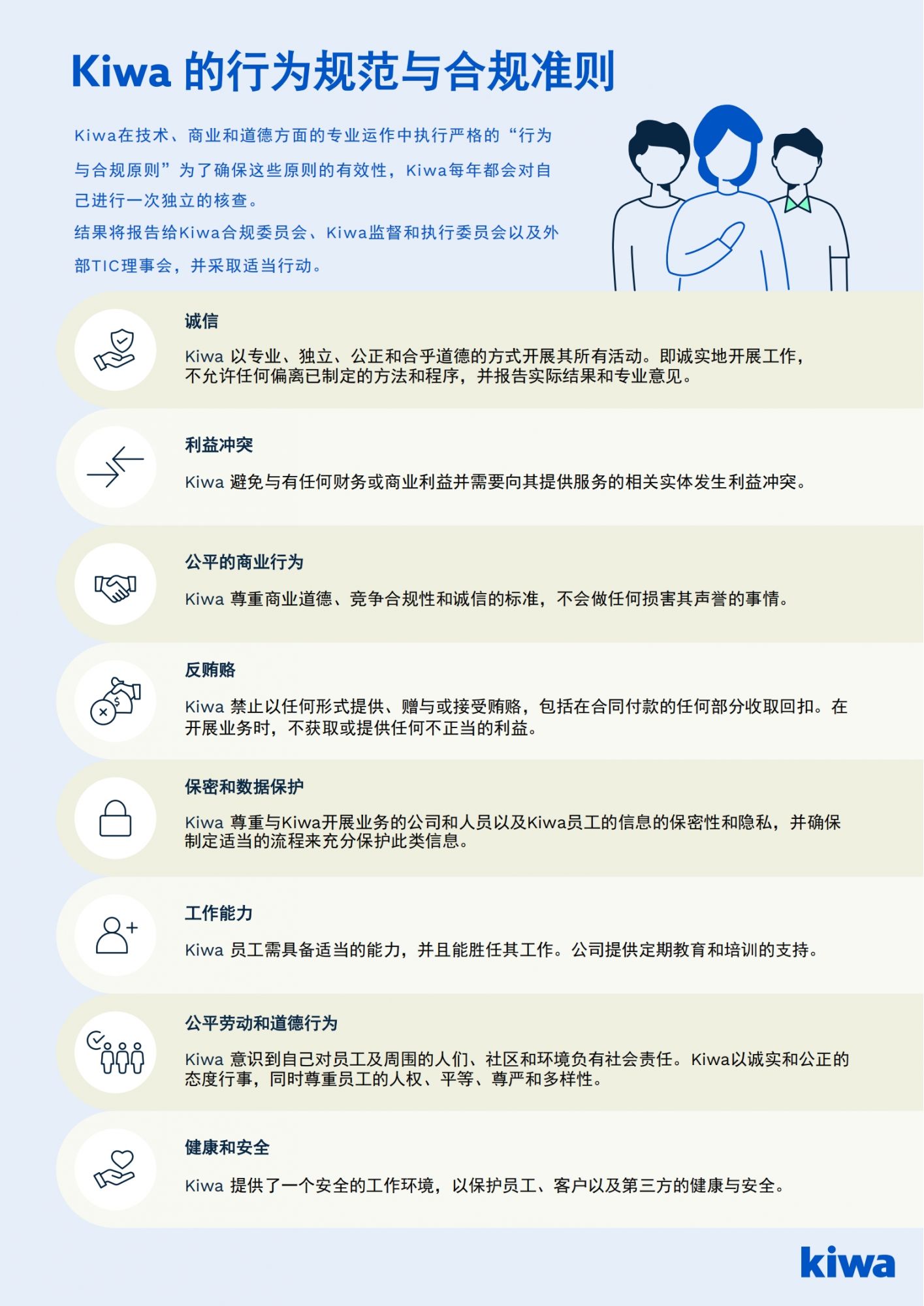 Kiwa致力于實現(xiàn)最高的道德和誠信標準。這意味著我們希望員工遵守Kiwa的行為和合規(guī)準則(以及基本的政策框架),并避免做出與我們的價值觀相沖突的商業(yè)決策,即使這些決策在財務上可能具有吸引力。